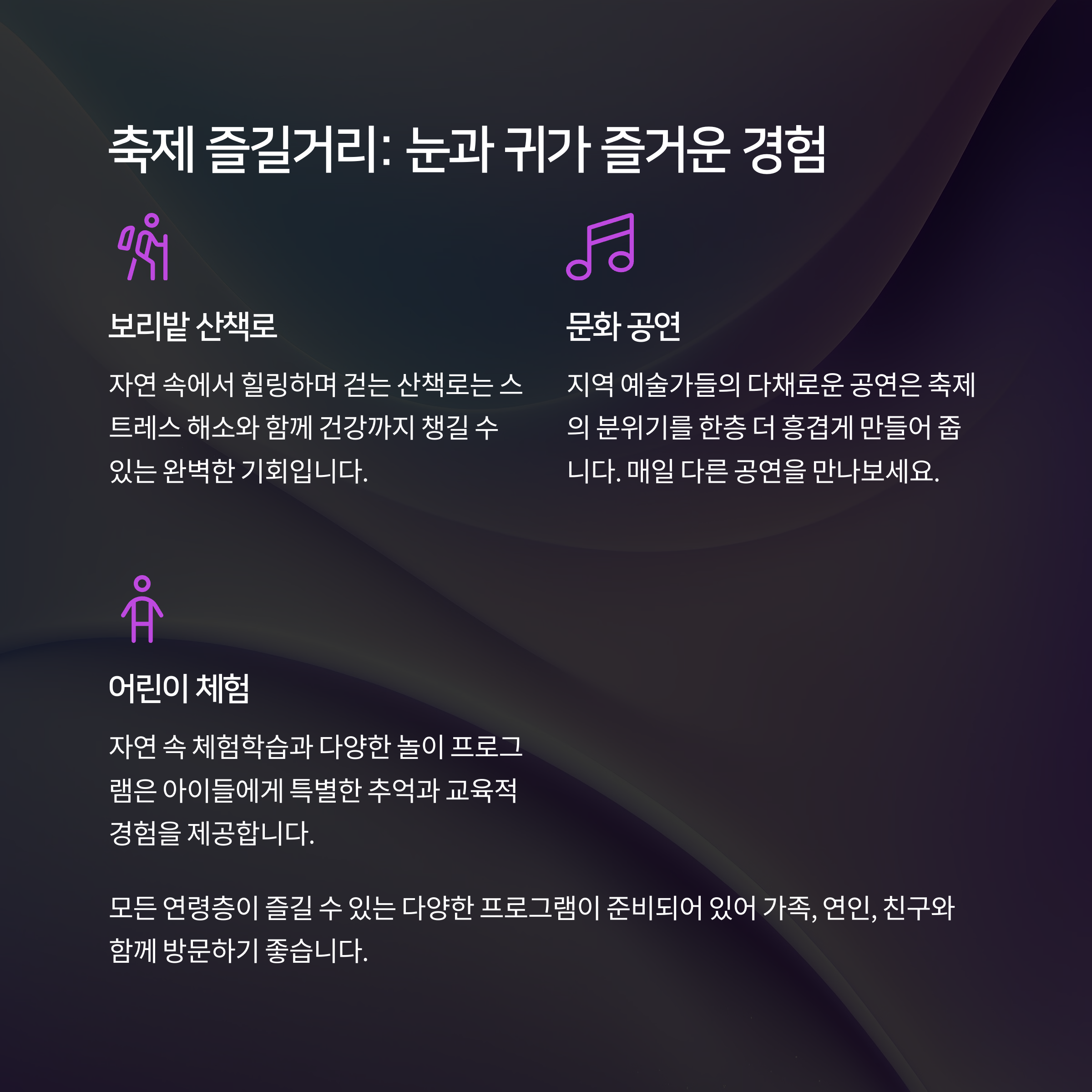 | 문화 공연 및 전시 | 지역 예술단의 공연, 전통 전시 등으로 볼거리도 풍성합니다. |