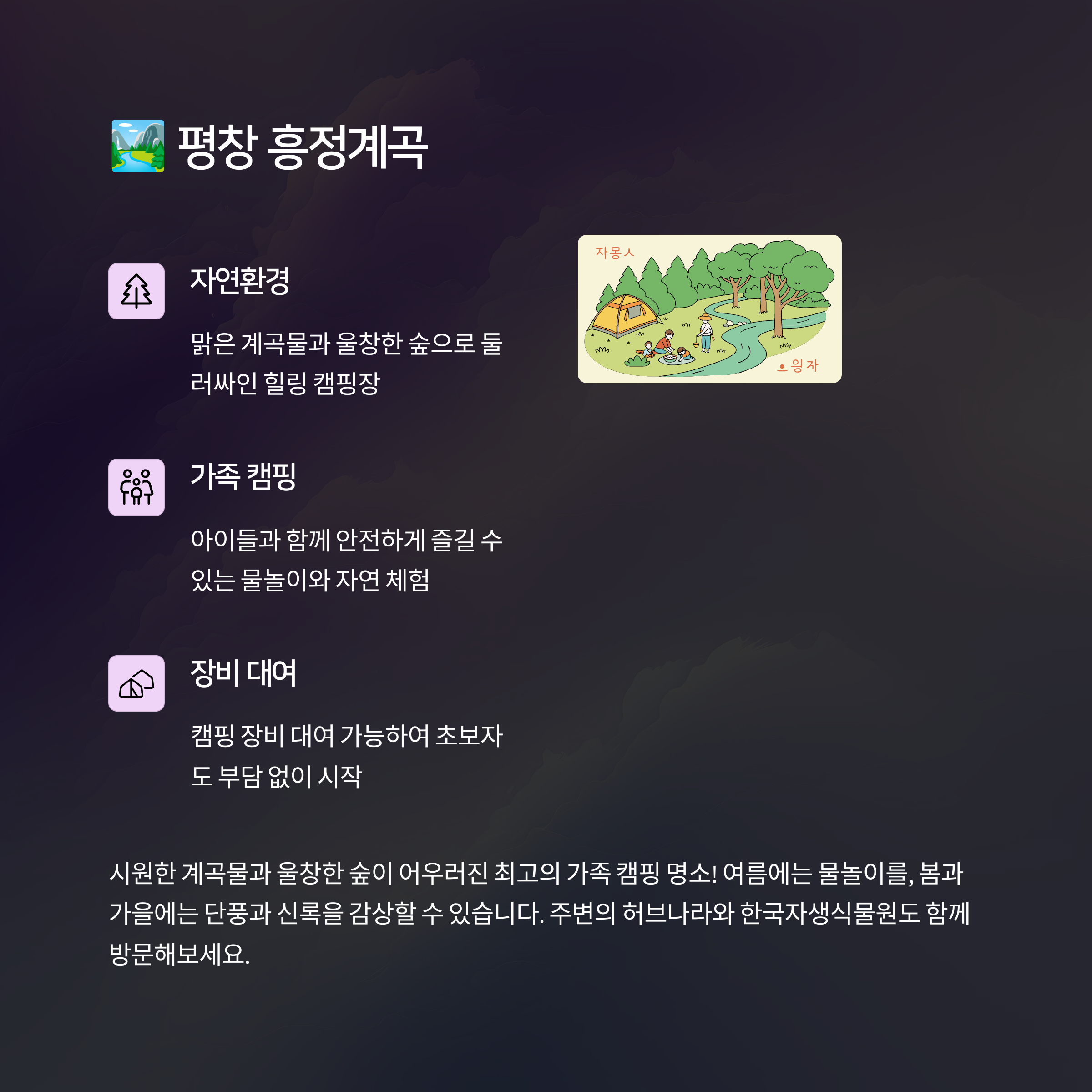 | 평창 흥정계곡 오토캠핑장 강원도 평창군 봉평면 |