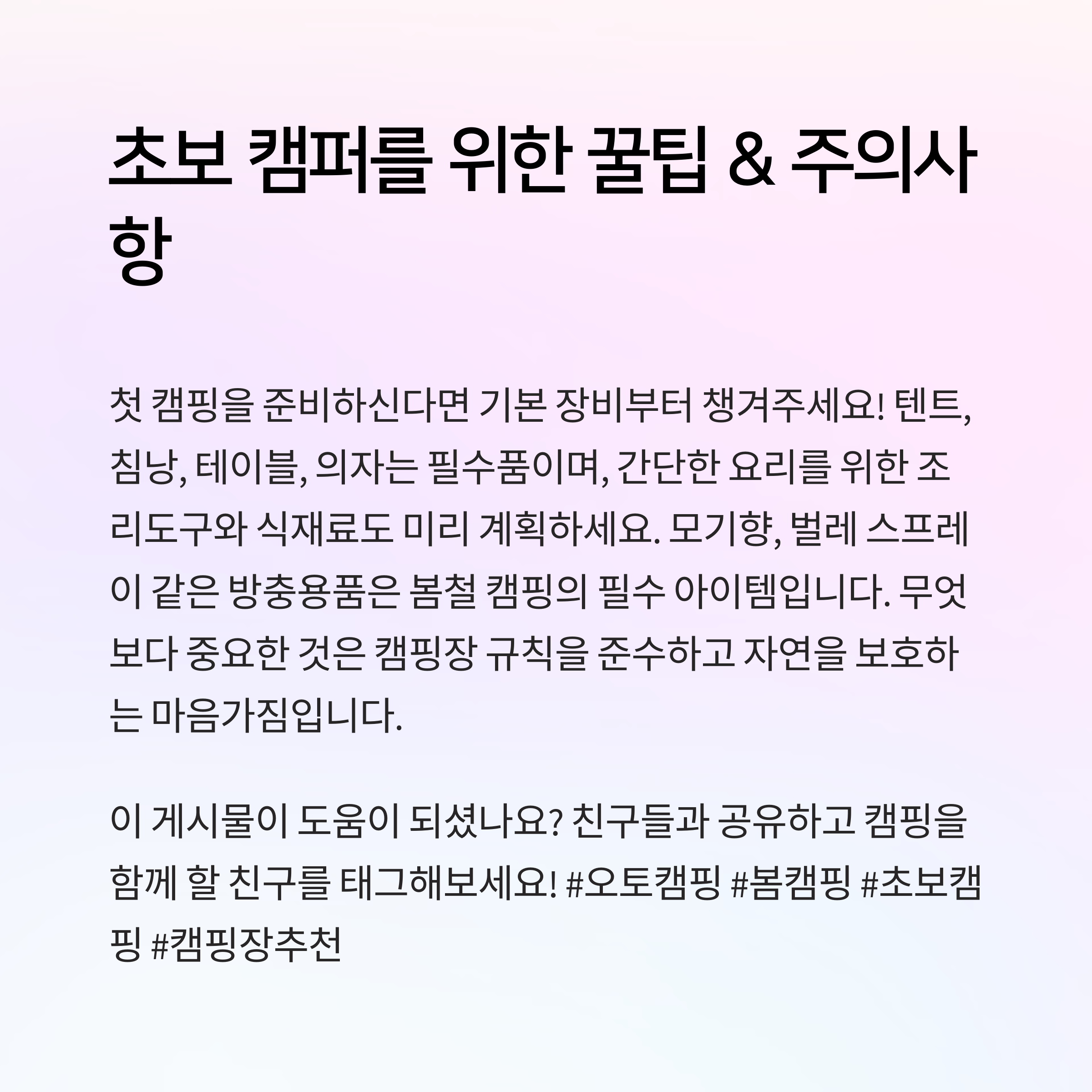 이번 봄, 캠핑 입문 고민 중이라면 지금이 딱! 준비는 저와 함께, 즐거움은 여러분 몫이에요. 다음엔 가을 캠핑 추천도 들고 올게요. 모두 안전하고 따뜻한 캠핑 되세요 ⛺🌸