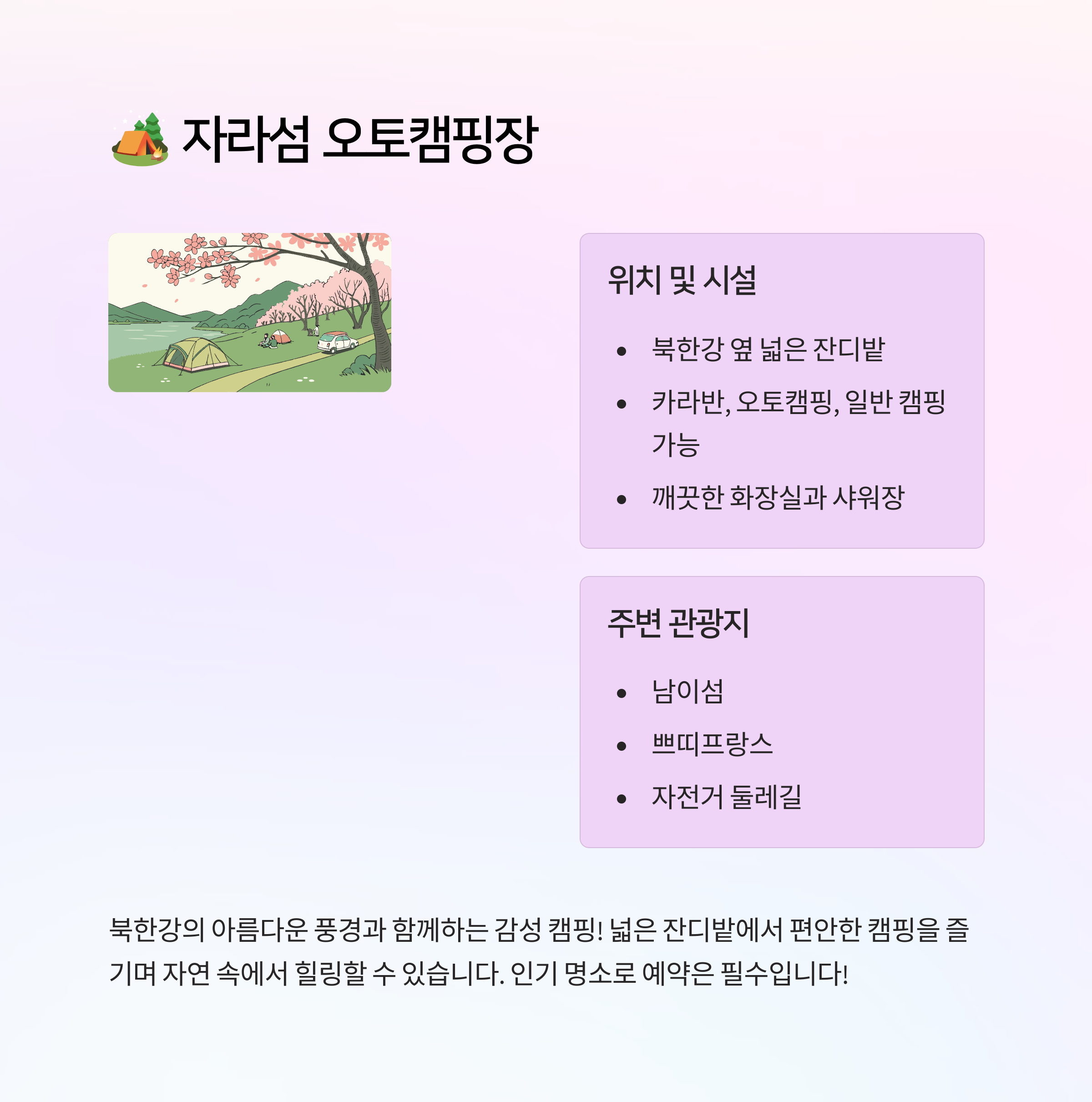 | 자라섬 오토캠핑장 가평군 자라섬로 60 |