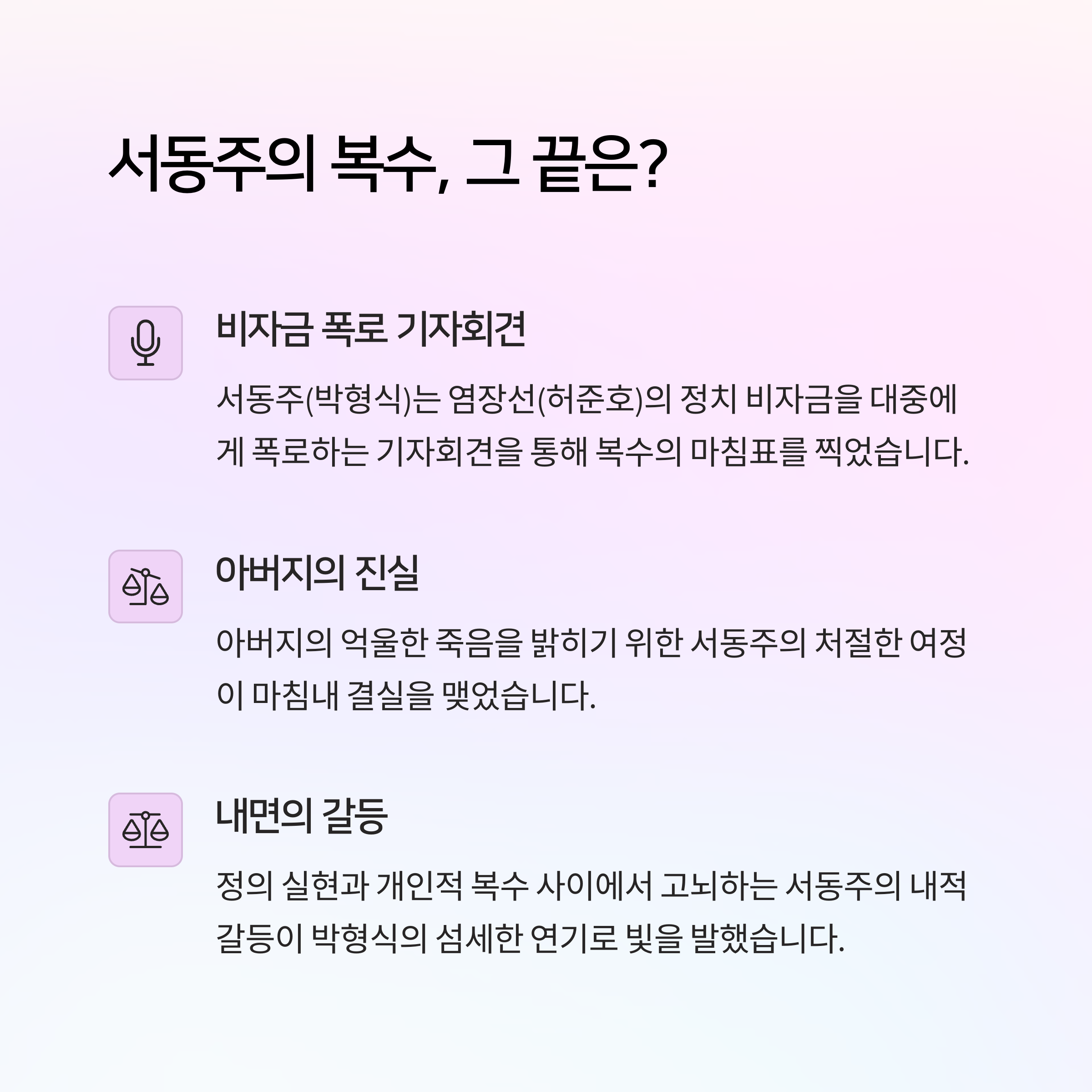 정의와 복수의 경계, 그리고 권력의 민낯을 담아낸 작품입니다. 누가 옳고 그른지를 단정 짓기보다, 스스로 질문을 던지게 만든 것이 가장 큰 메시지였죠.
