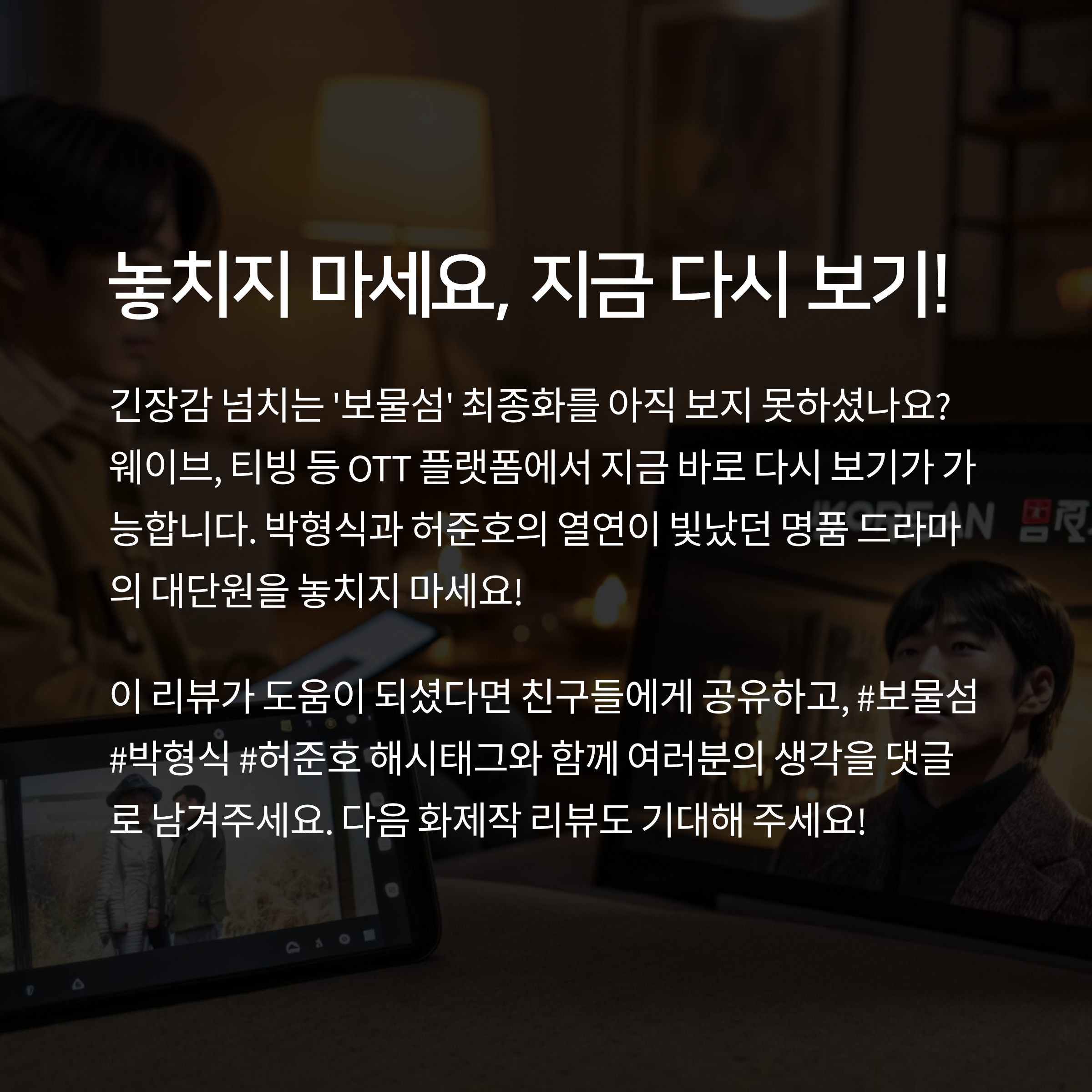 ‘보물섬’은 단순한 복수극 이상의 무게감을 품은 작품이었습니다. 마지막 회를 보고 나니 그냥 ‘끝났다’는 느낌보다는, 마음 한켠에 잔잔한 물결이 남더라고요. 염장선의 실종, 서동주의 흔들리는 눈빛, 그리고 그 속에 담긴 복잡한 감정선까지… 시청자 입장에서는 참 많은 생각을 하게 된 엔딩이었어요.