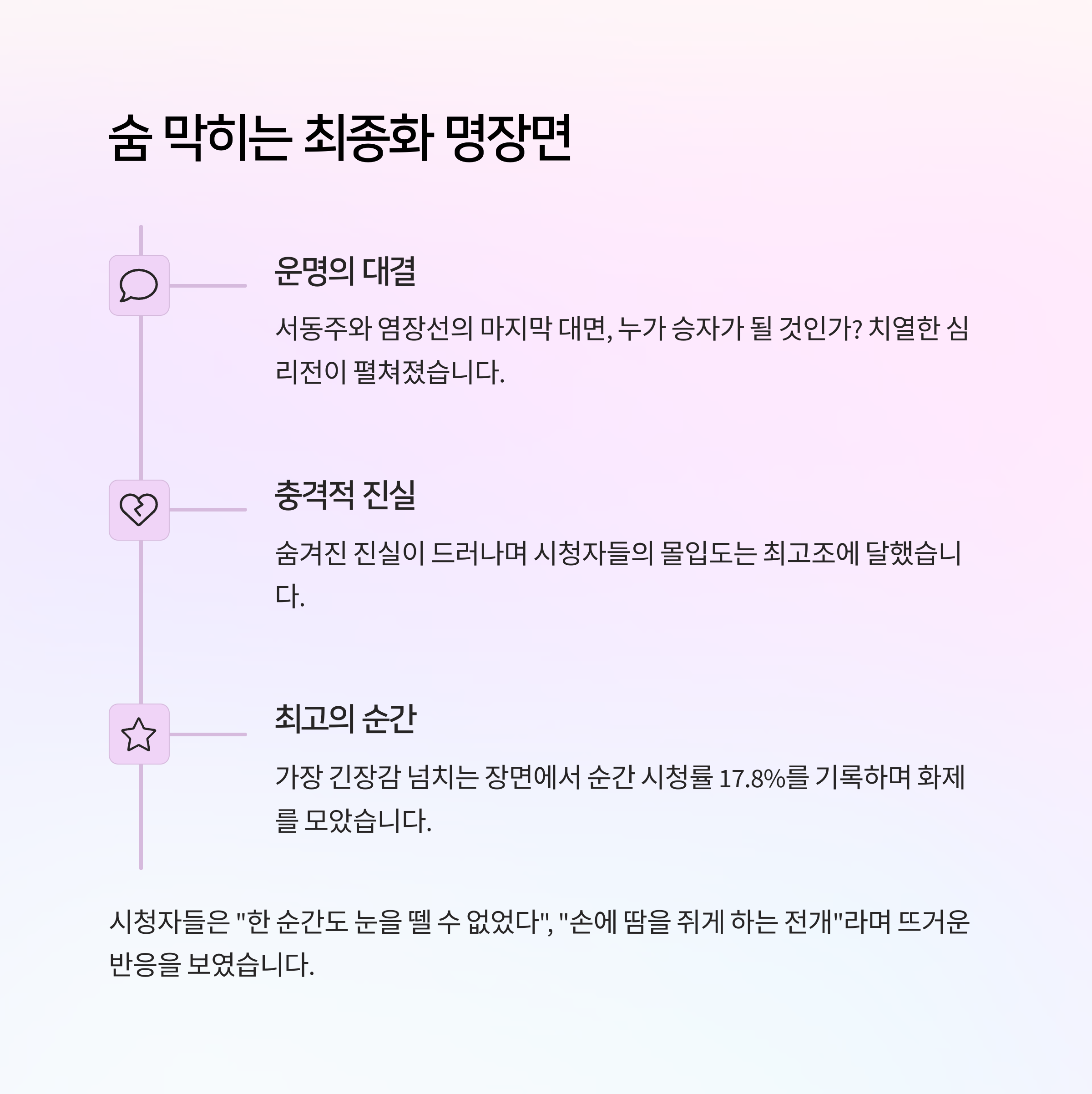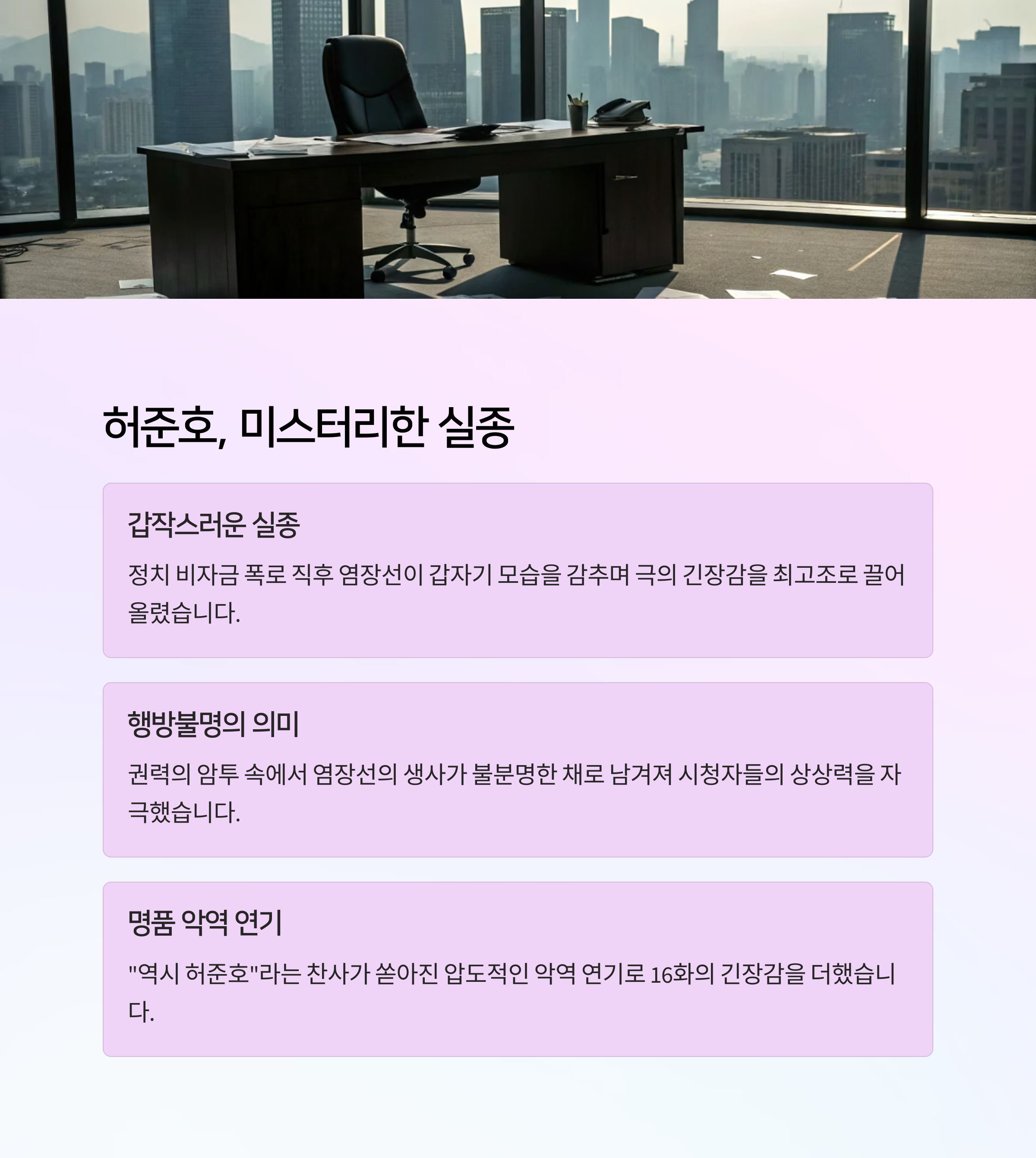 그러나 두 사람의 마지막 대면 이후, 염장선은 흔적도 없이 사라져버립니다. 자취를 감춘 그의 모습은 시청자들에게 ‘이게 끝인가?’라는 긴 여운을 남기며 복수극의 종언을 알렸어요.