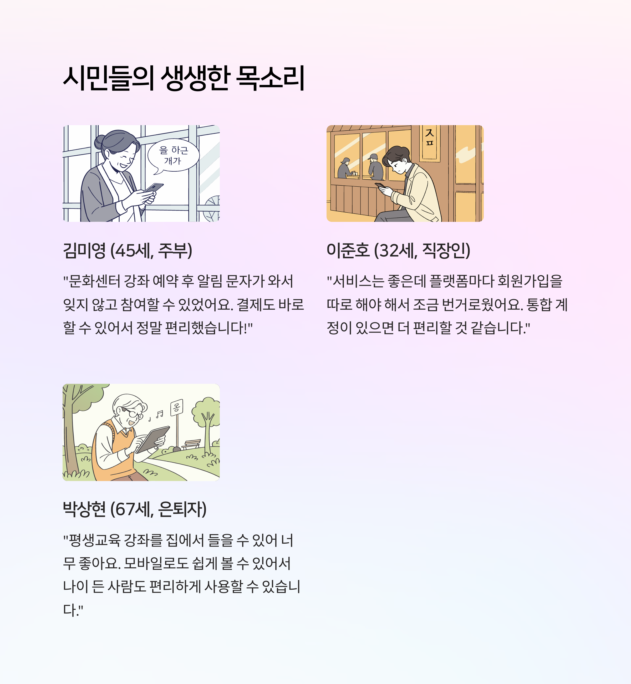 | gimpo_mom77 | “평생교육 신청은 편했는데, 체육센터랑 문화강좌는 다른 시스템이라 다시 로그인했어요ㅠㅠ 통합되면 좋겠어요.” |
