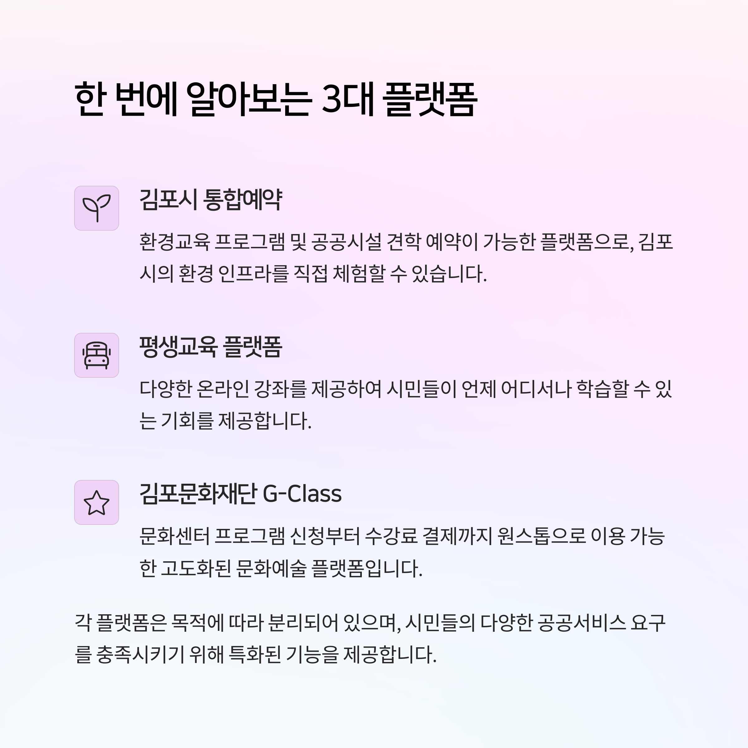 이전에 소개했던 여주시와 비교해보면, 김포시는 규모가 큰 만큼 플랫폼의 수는 많지만 **아직까지 ‘완전한 통합’은 이루어지지 않은 과도기**적 단계입니다. 하지만 각 플랫폼의 역할이 명확하고, UX 측면에서는 큰 불편함 없이 안정적인 구조를 갖추고 있어요.