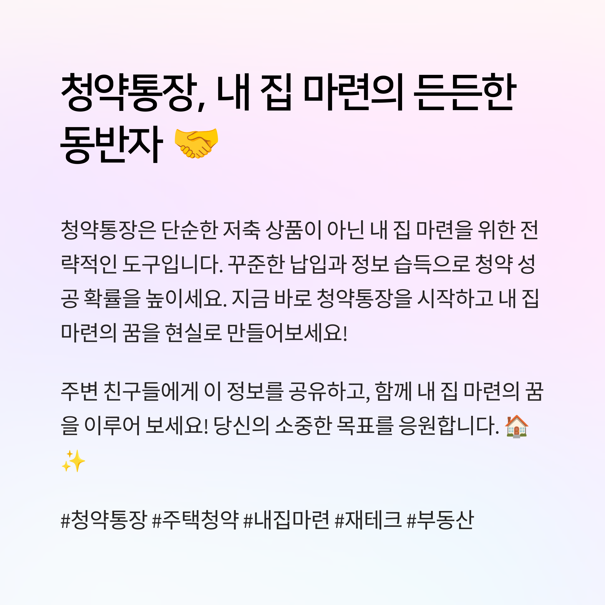 청약통장, 단순히 만들어두기만 하면 되는 줄 알았다면 이제 생각을 좀 바꿔야겠죠? 언제, 얼마를, 어떻게 넣느냐에 따라 여러분의 당첨 확률은 확연히 달라집니다. 지금 당장은 청약계획이 없어도 통장은 ‘꾸준히’ 관리하는 게 답이에요. 다음 콘텐츠에선 본격적으로 ‘가점 관리’ 전략 들어가니까, 지금 통장부터 다시 점검해보는 건 어떨까요? 진짜 기회는 준비된 사람에게만 오니까요!