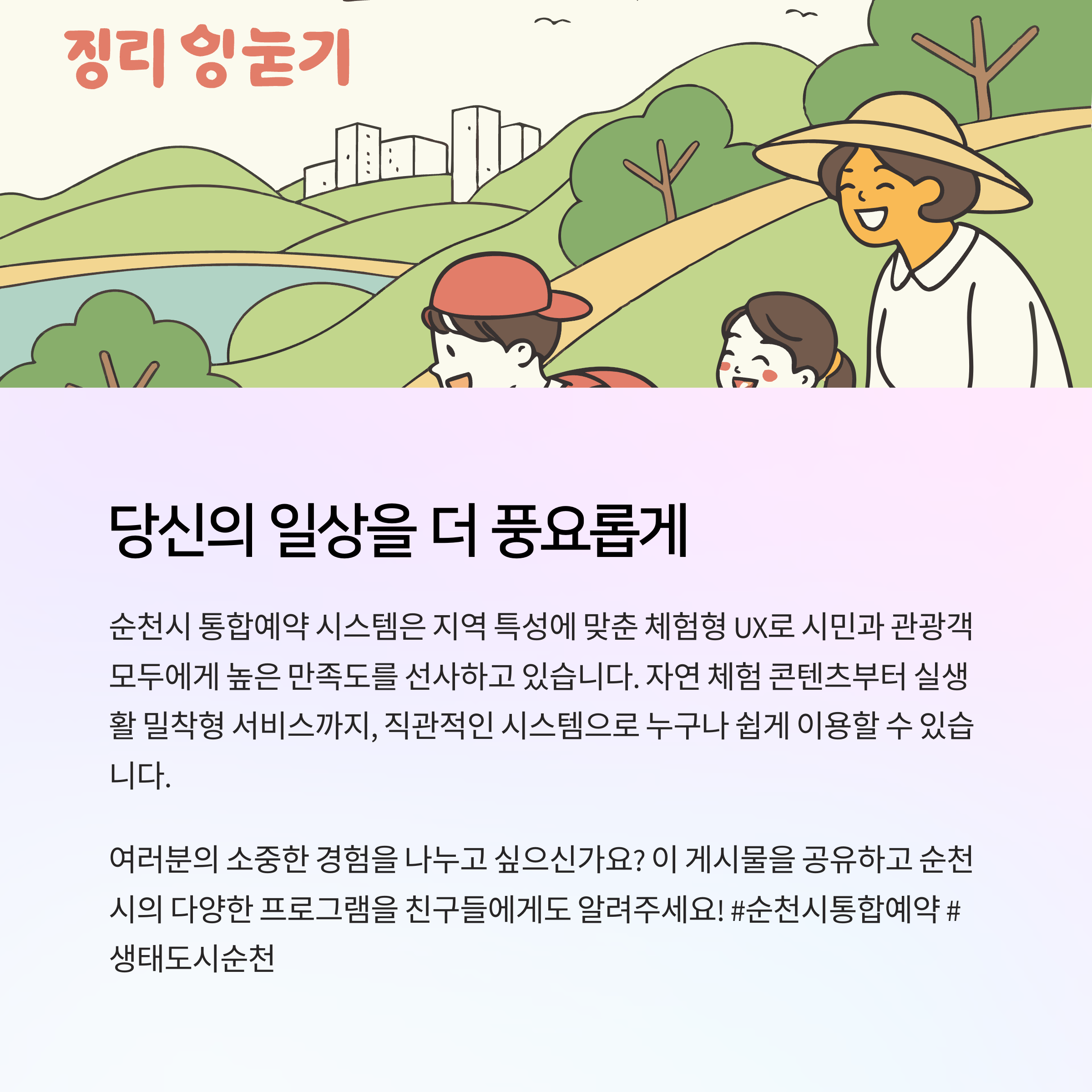 순천시의 예약 플랫폼은 단순 교육/강좌를 넘어, ‘생태문화 체험 콘텐츠’를 행정 시스템에 자연스럽게 녹여낸 것이 핵심입니다.