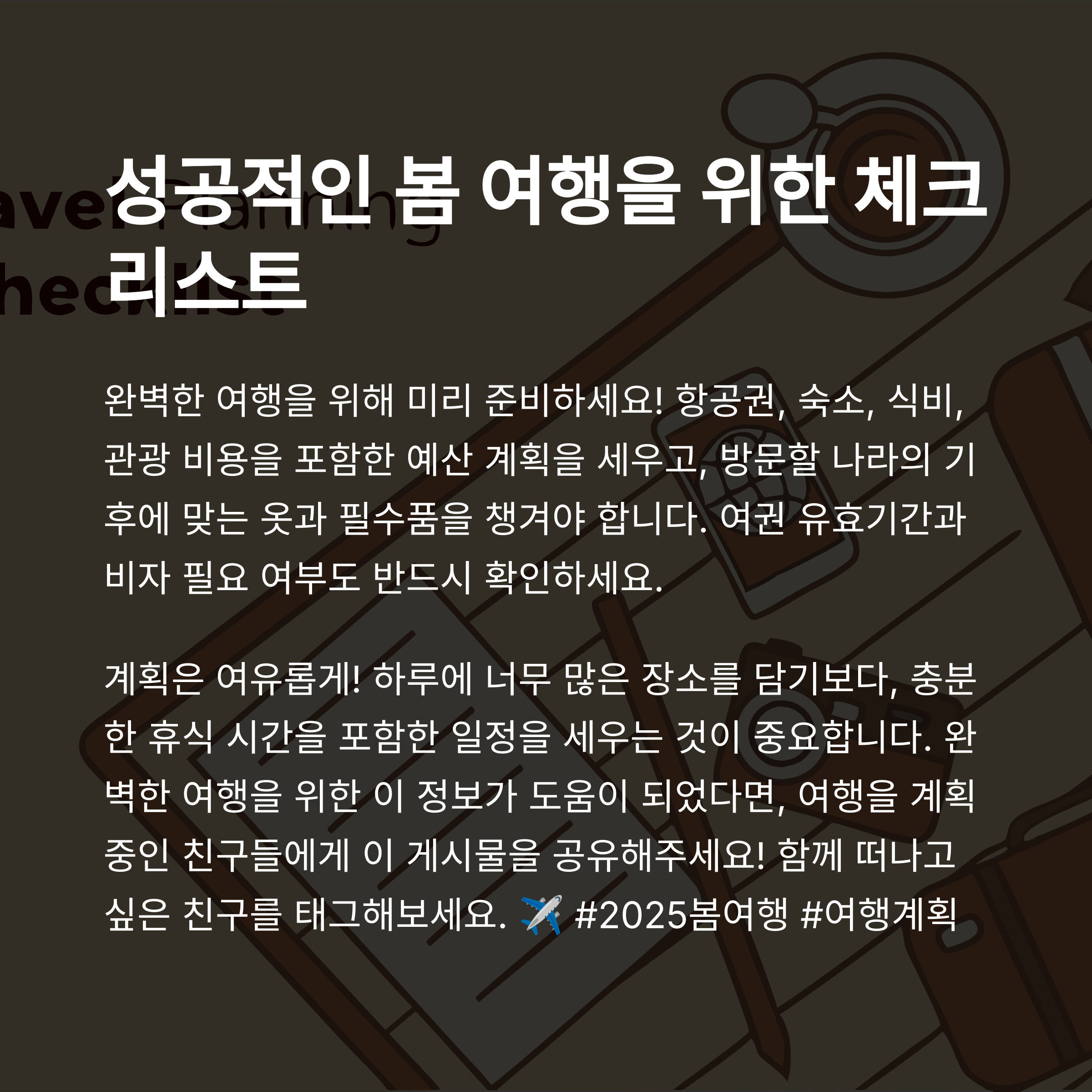 혹시 어디로 떠날지 아직 고민이라면, 위에 소개한 테마 여행지들을 찬찬히 다시 읽어보세요. 그리고 마음 가는 곳, 그곳이 정답입니다. 올해 봄은 여러분 인생에 한 페이지로 남을 특별한 계절이 될 거예요. 🌸✈️