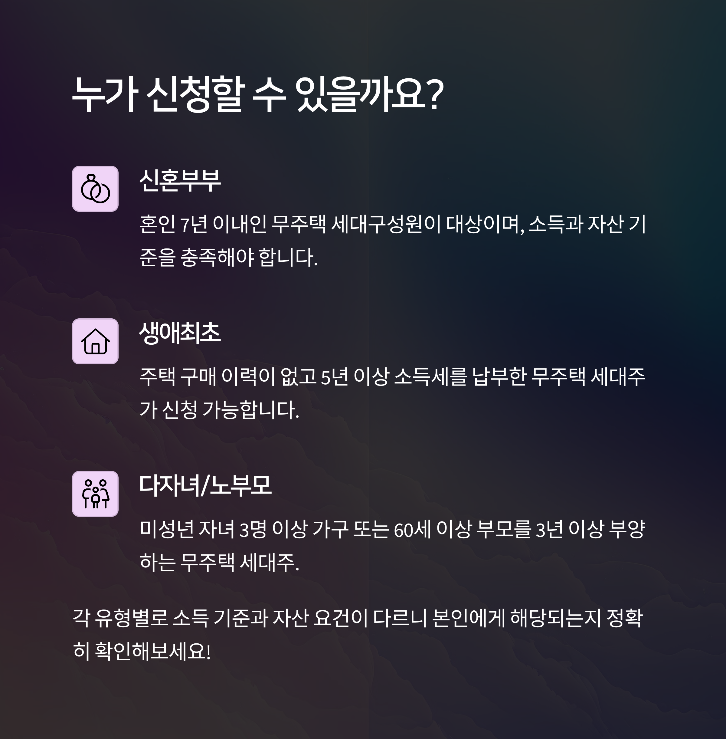 | 신혼부부 | 혼인 7년 이내 + 무주택 + 소득 조건 충족 |