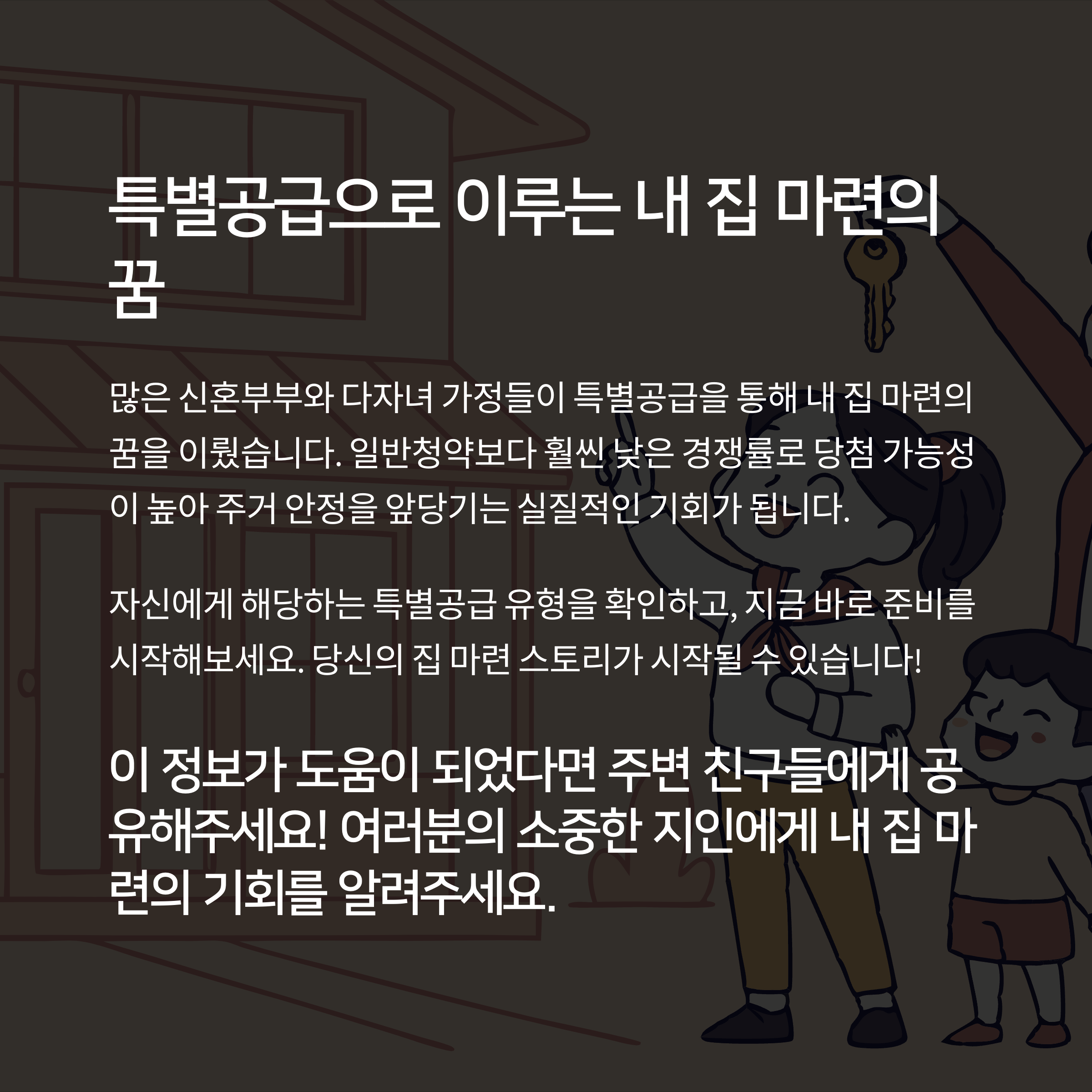 특별공급 제도는 그냥 ‘옵션’이 아니라, 가점 낮은 사람들에겐 거의 ‘기회 그 자체’야. 자격만 된다면 반드시 도전해보는 게 좋아. 신혼, 생애최초, 다자녀든 뭔가 하나라도 해당된다면 지금 바로 청약홈 들어가서 공고문부터 확인해보자. 지금 준비해두면, 진짜 기회가 왔을 때 놓치지 않을 수 있으니까!
