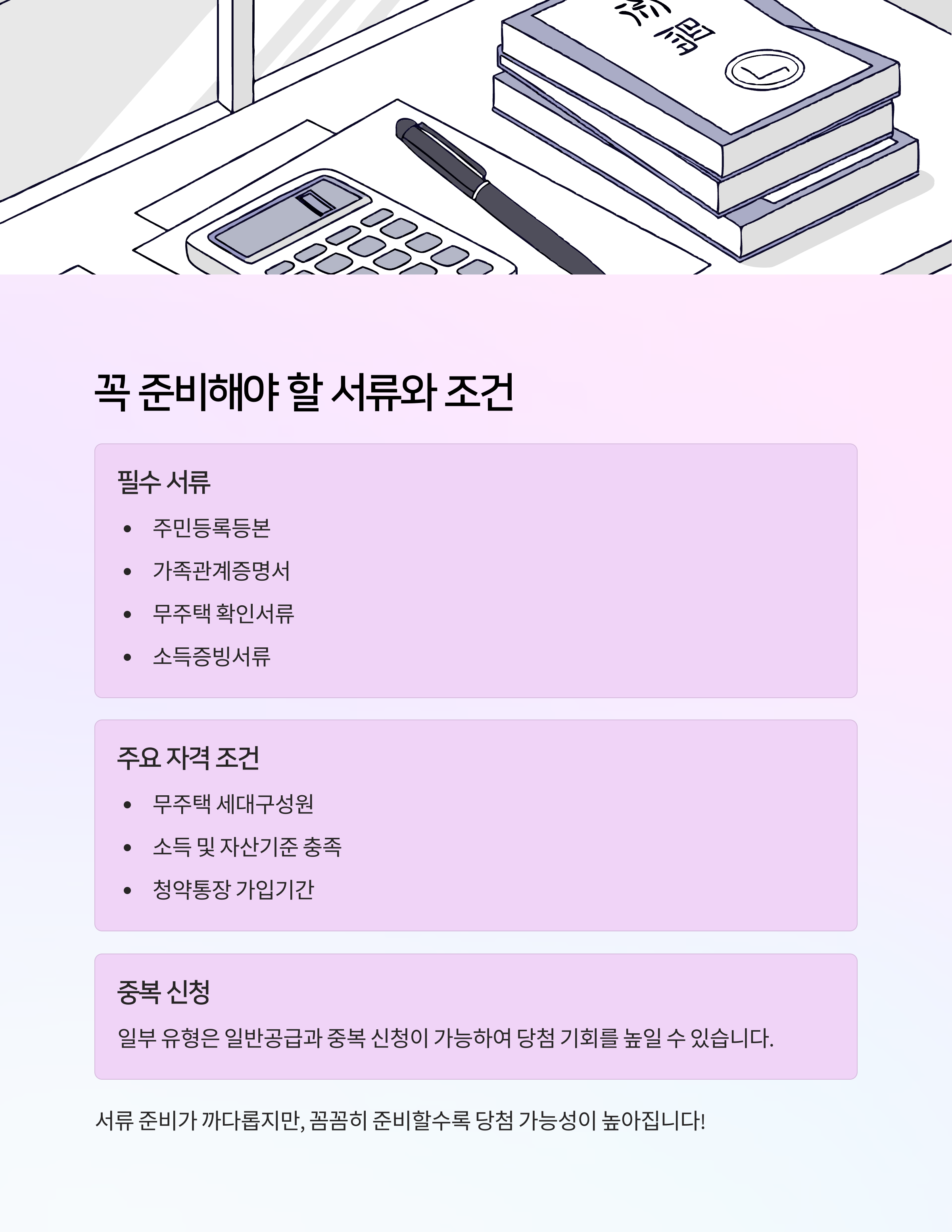 특별공급은 조건이 명확한 대신 증빙 서류가 진짜 중요해! 빠짐없이 준비하지 않으면 당첨이 돼도 부적격 처리 될 수 있어. 아래 서류는 유형에 따라 조금씩 다르지만, 기본은 공통이야.