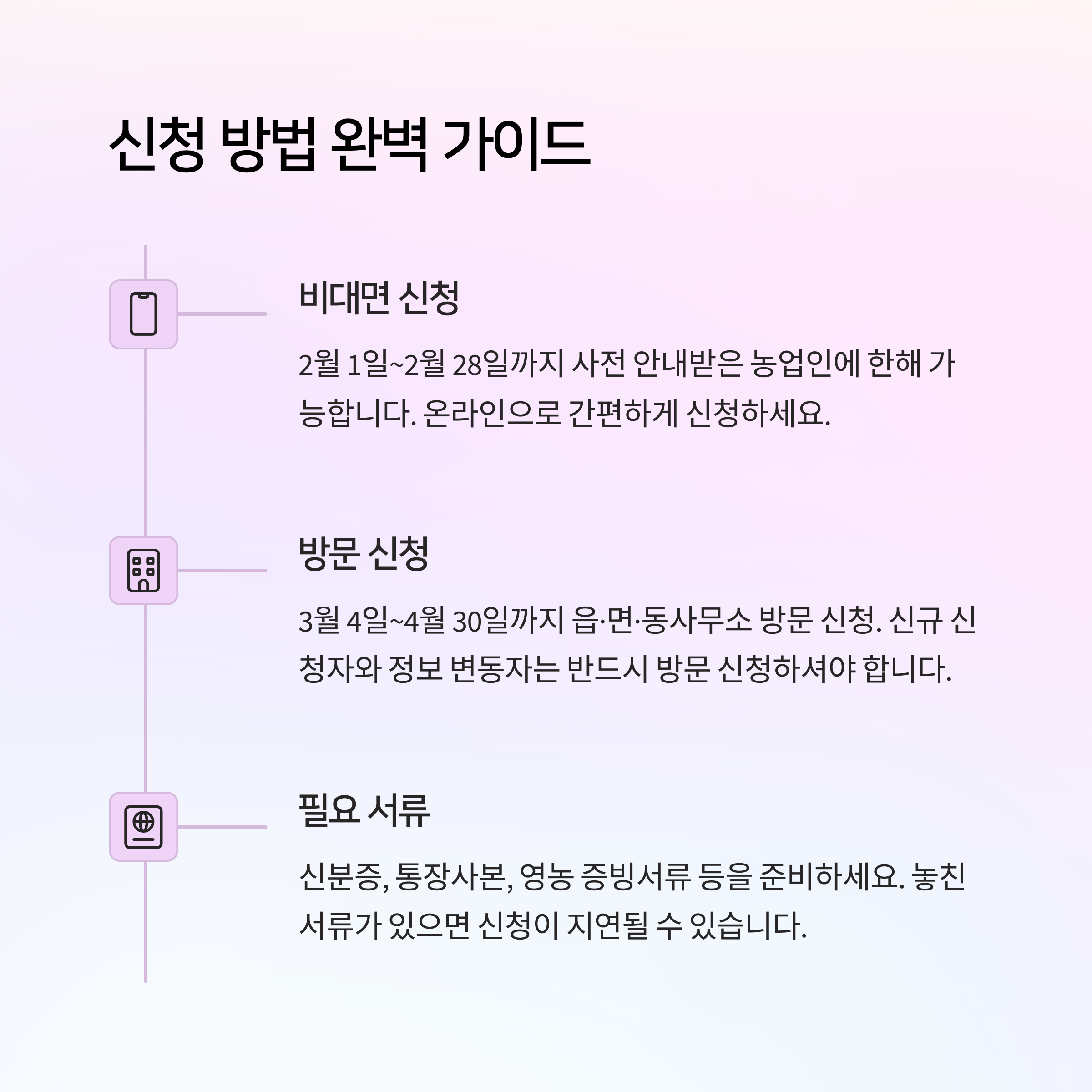 기본 신청서 외에도 임대차계약서, 경작사실확인서, 주민등록등본 등 상황에 따라 준비해야 할 서류가 달라질 수 있으니 미리 확인하고 방문하는 것이 좋아요.