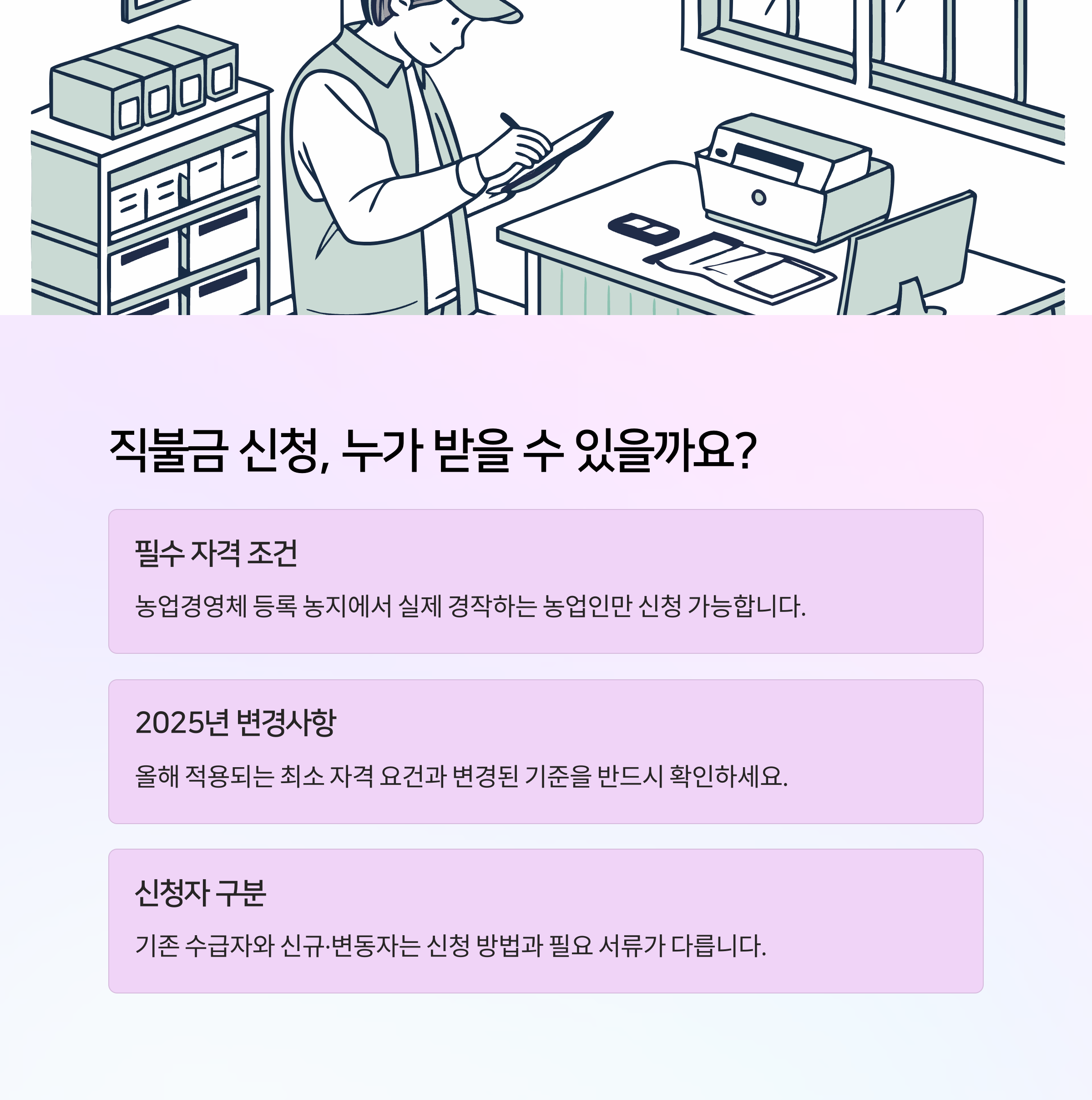 신청 대상은 농업경영체 등록이 완료되어 있고, 실제로 농사를 짓고 있는 농업인이에요. “실경작 여부”가 핵심이기 때문에 실제로 농지에서 작업하고 있어야 인정받을 수 있어요. 2024년 정보와 2025년 정보가 일치하고, 별다른 변경사항이 없다면 비대면 신청도 가능합니다.