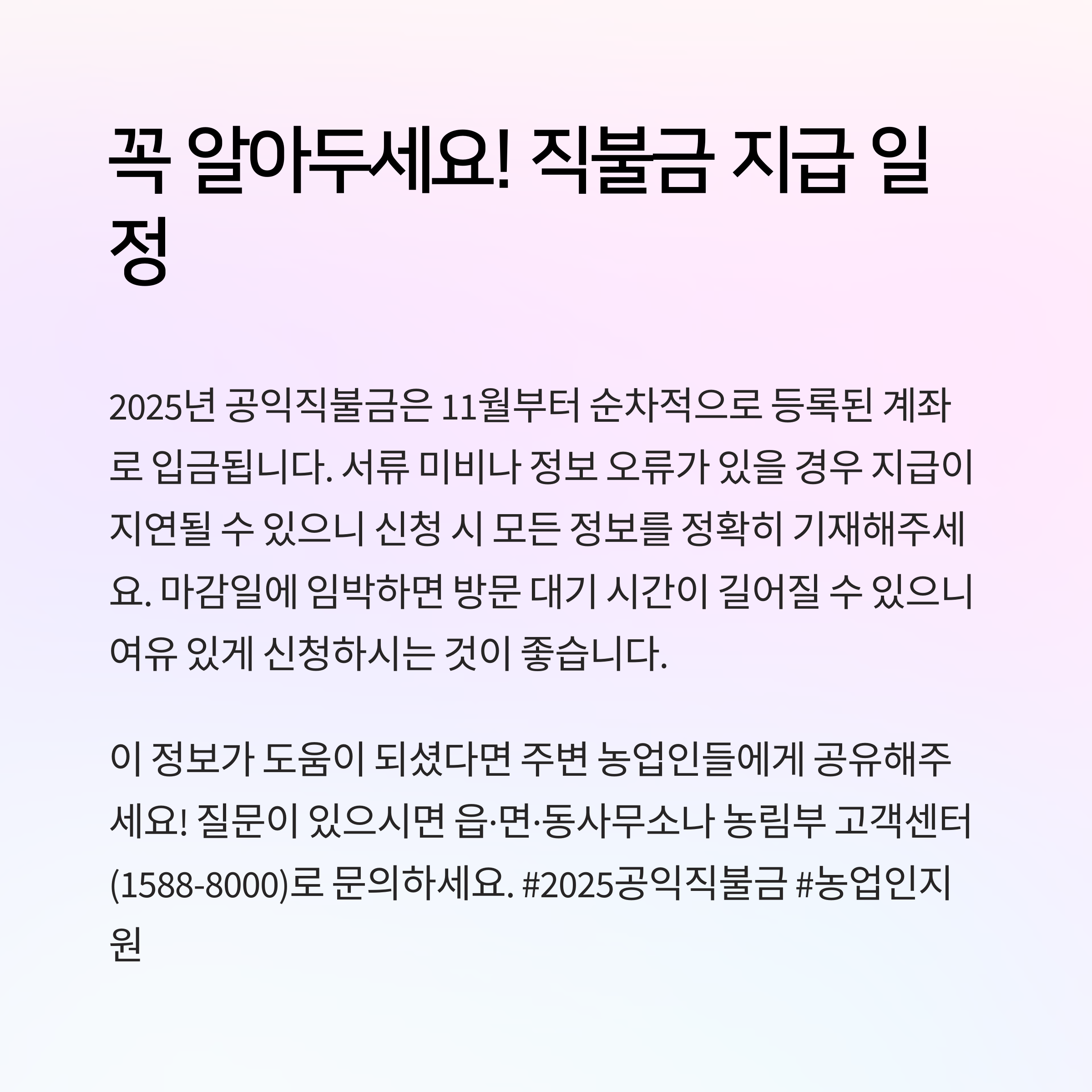 궁금한 점이 있다면 공익직불제 콜센터(☎1334)로 문의하세요. 연중 운영되며, ARS를 통해 간편 신청도 가능합니다. 또한 가까운 읍·면·동 행정복지센터에 방문하면 서류 작성이나 신청 관련 도움도 받을 수 있어요. 특히 고령 농업인 분들께는 대면 신청이 더 수월하실 수 있으니 참고하세요.