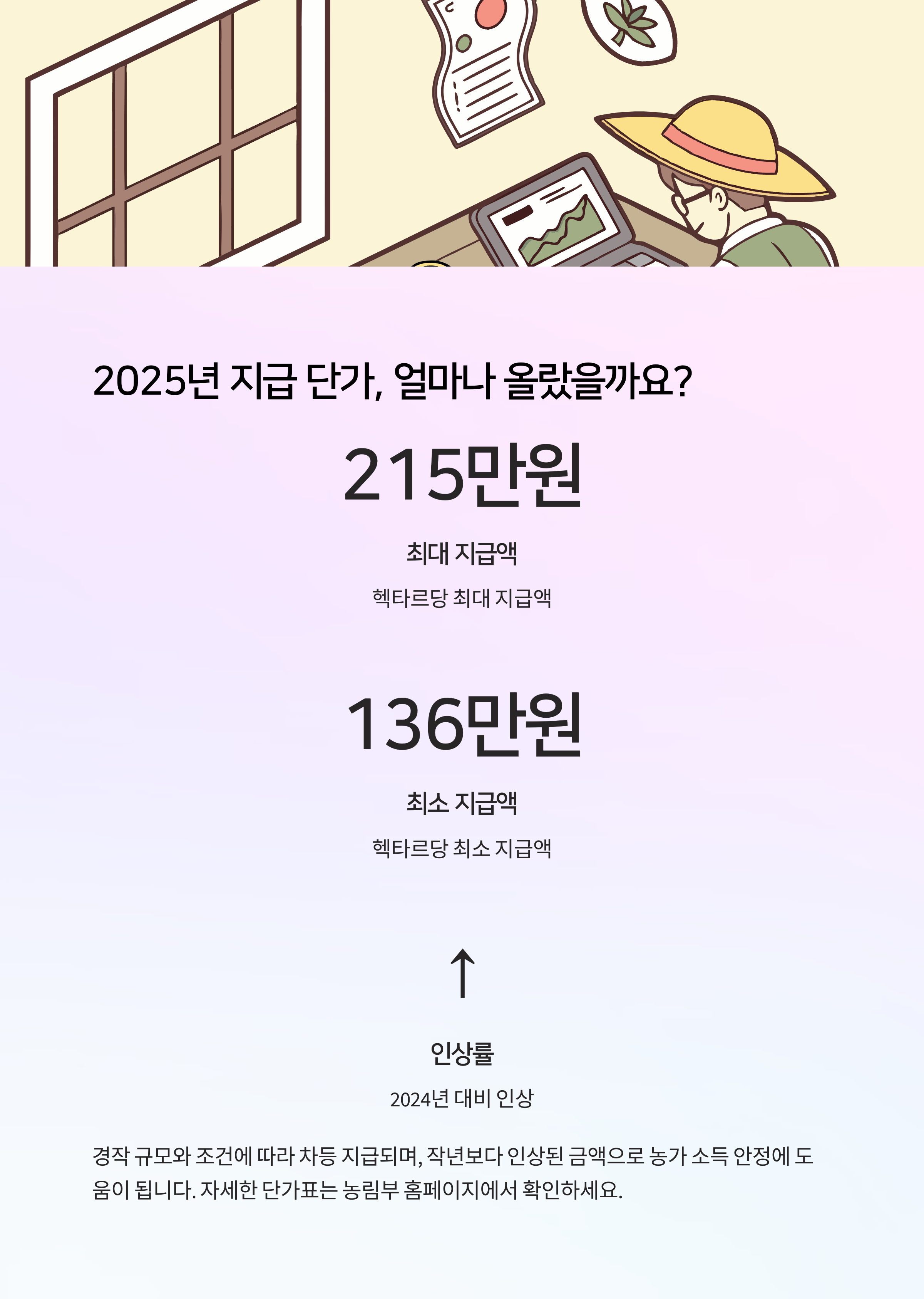 2025년에는 기존보다 지급 단가가 평균 5% 정도 인상됐고, ha당 136만 원에서 최대 215만 원까지 받을 수 있어요. 특히 소농직불금은 정액으로 120만 원이 지급됩니다. 이게 은근히 큰 보탬 되거든요!