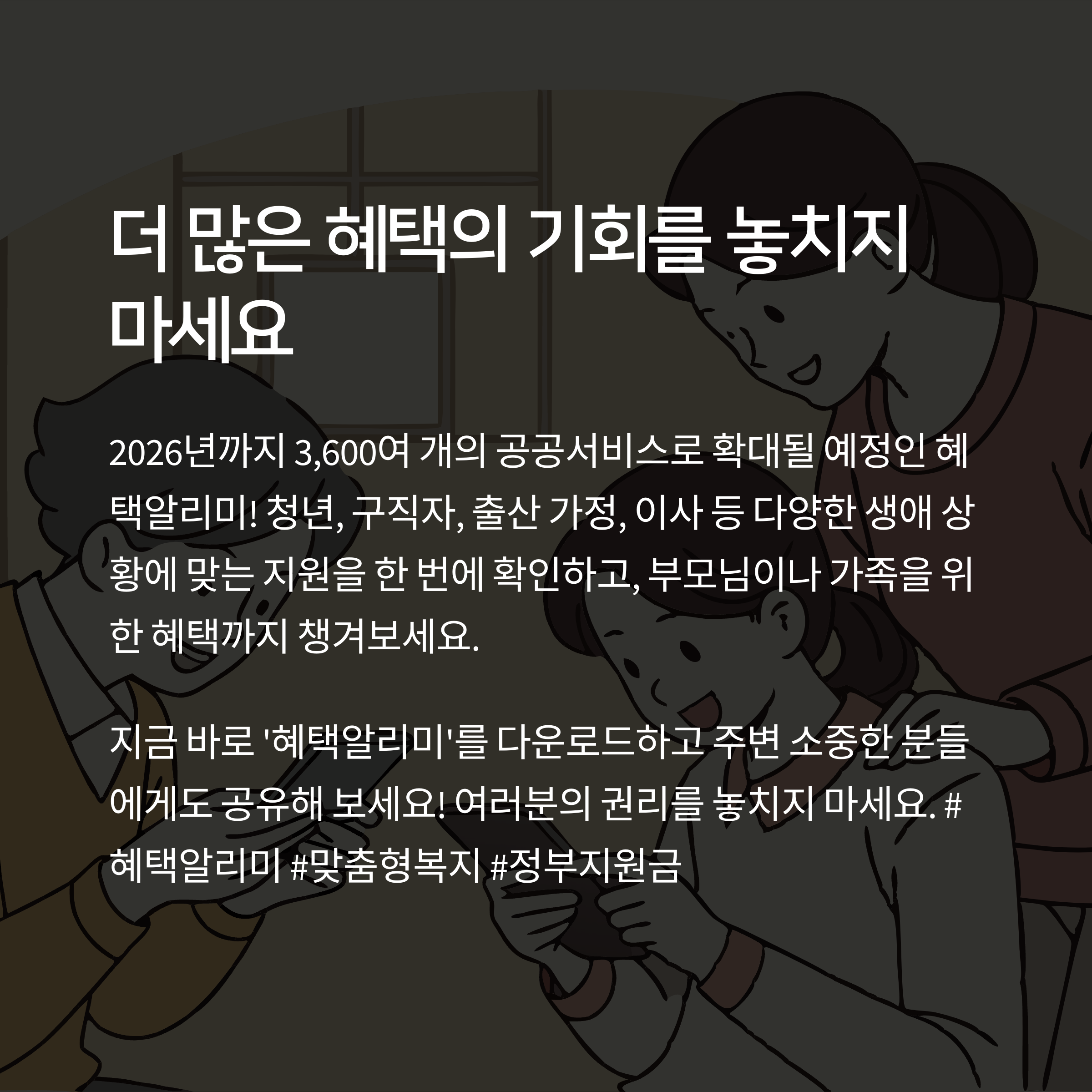혜택알리미 앱, 솔직히 꼭 깔아야 하는 앱 중 하나예요. 회원가입도 없이 바로 쓸 수 있고, 숨겨져 있던 정부 혜택도 자동으로 알려줘서 너무 유용했어요. 특히 청년, 구직자, 임산부, 1인 가구, 어르신 등 본인 상황에 맞춘 맞춤 혜택이 매일 업데이트되니까, 진짜 생활에 도움이 되는 정보들이 많습니다. 아직 설치 안 하셨다면 지금 바로 앱스토어에서 ‘혜택알리미’ 검색해보세요. 우리 가족 모두의 복지, 놓치지 마세요!