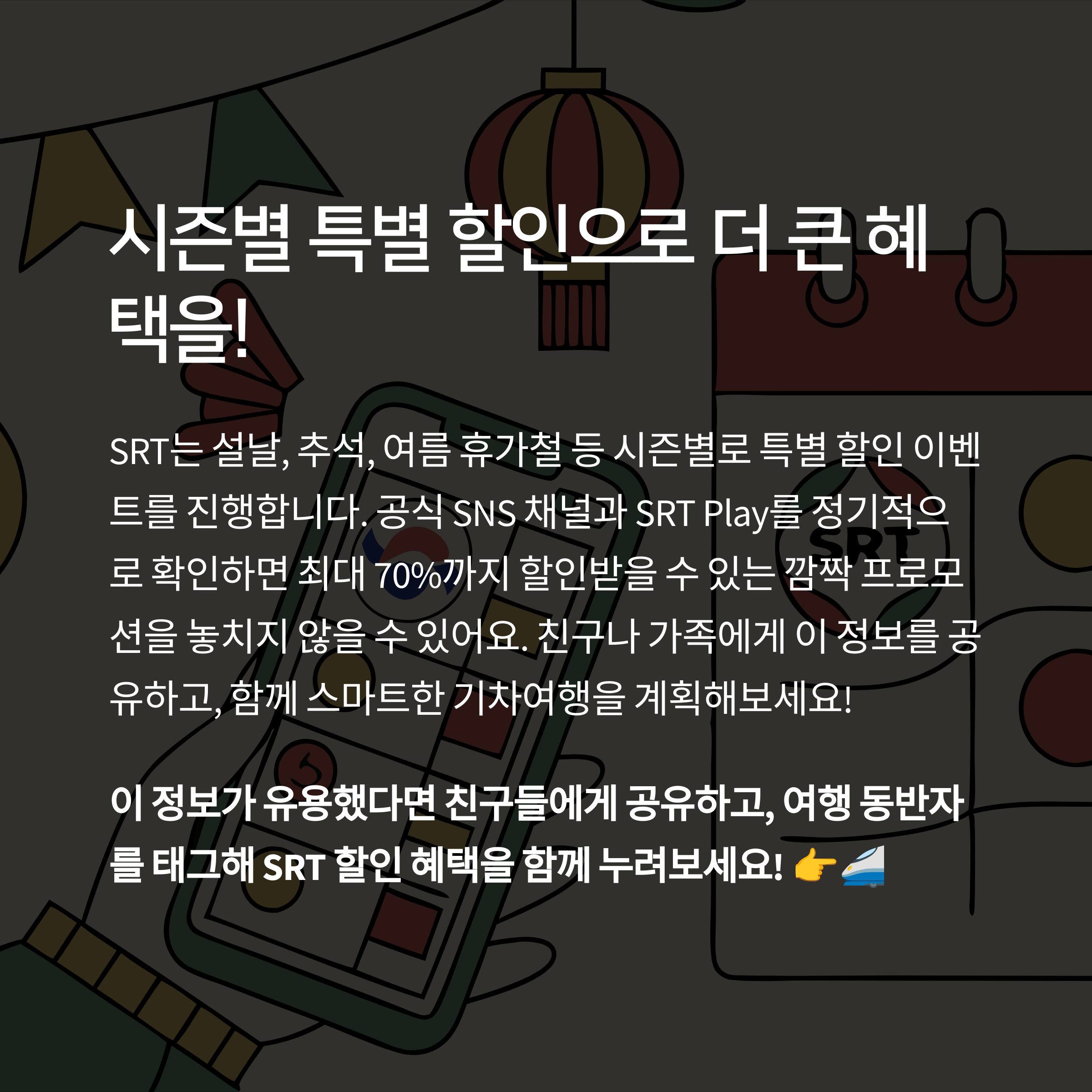 | SRT Play 특가 | 출발 직전 잔여 좌석 | 최대 70% | 전용 앱에서 실시간 할인 적용 |