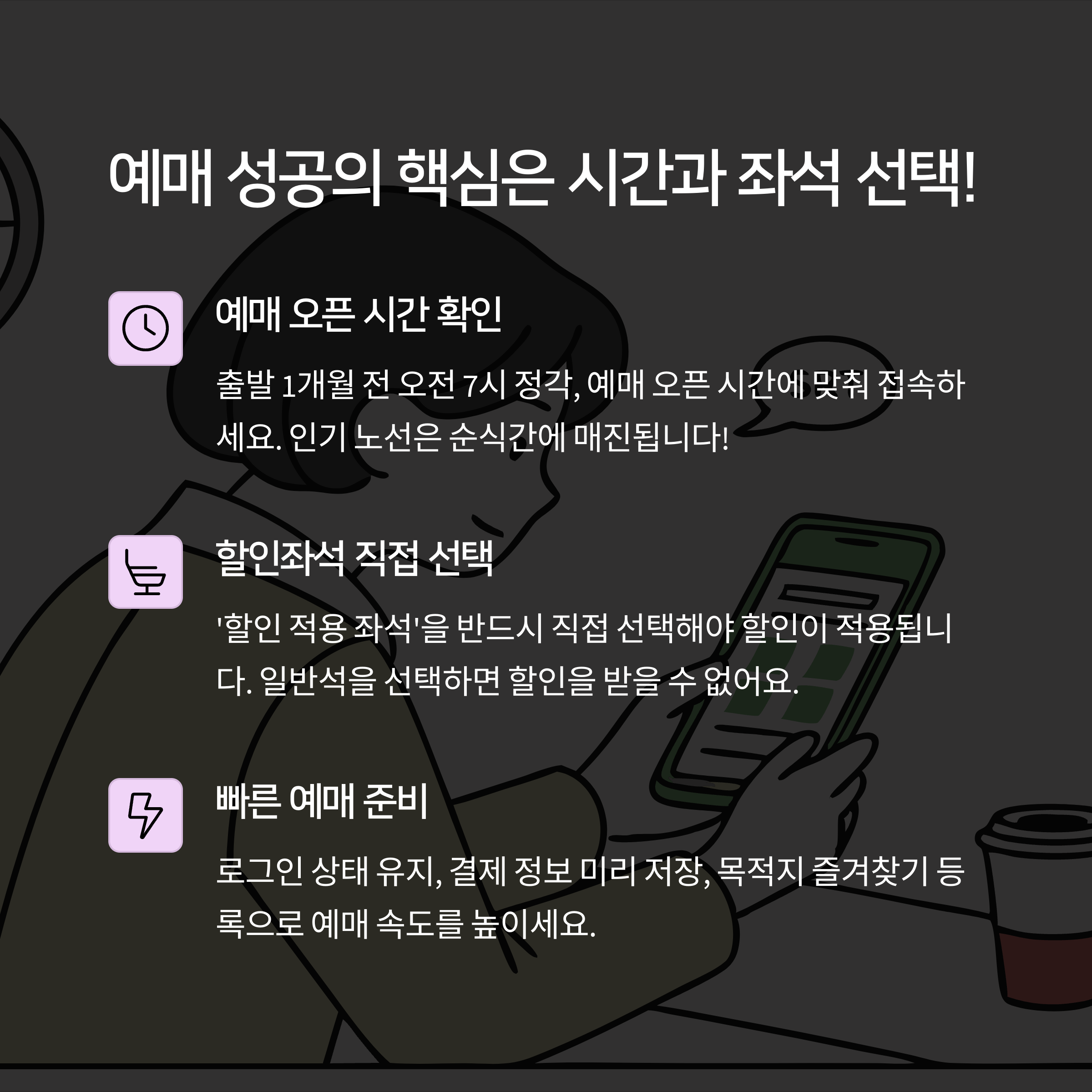 할인 좌석은 한정 수량으로 제공되기 때문에, 예매 오픈 시간인 출발 1개월 전 오전 7시를 꼭 기억해두세요. 인기 시간대는 정말 순식간에 매진되니까요!