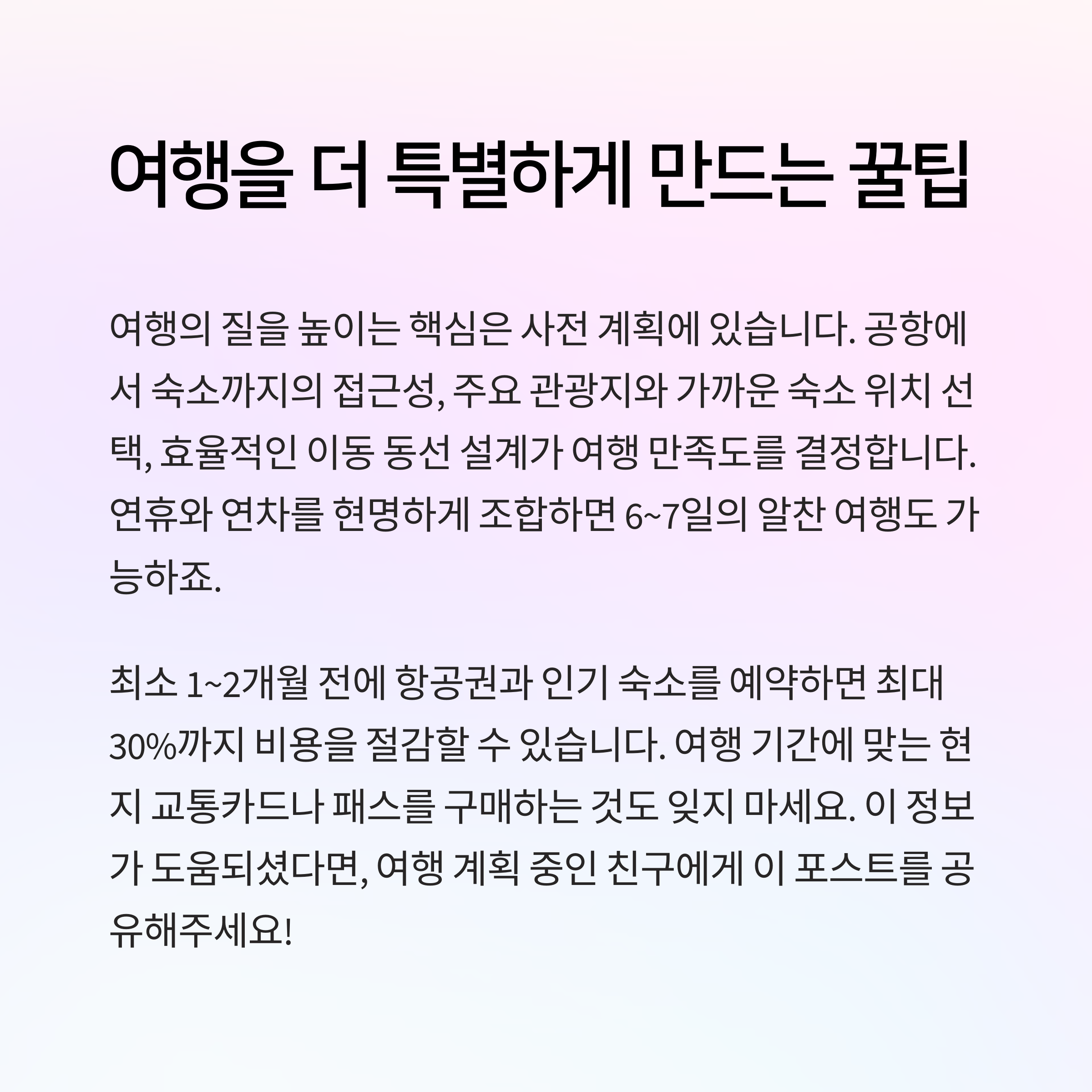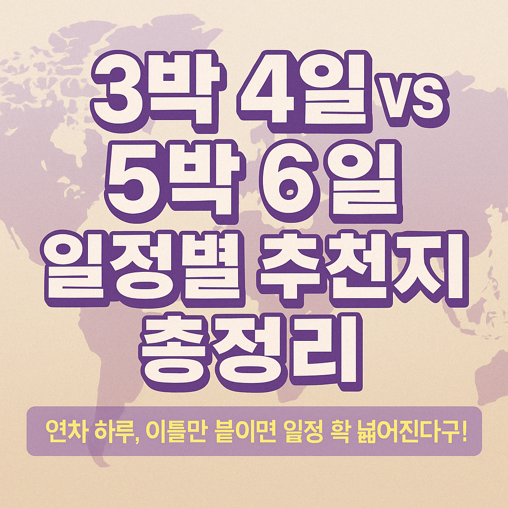3박 4일이든 5박 6일이든 중요한 건 내 일정에 딱 맞는 여행지를 고르는 거예요. 무작정 떠나기보단, 짧은 일정엔 동선 압축! 긴 일정엔 여유와 힐링! 이걸 기억하면 후회 없는 여행이 되죠. 이번 콘텐츠가 여러분의 휴가 설계에 작은 힌트가 되었길 바랄게요.