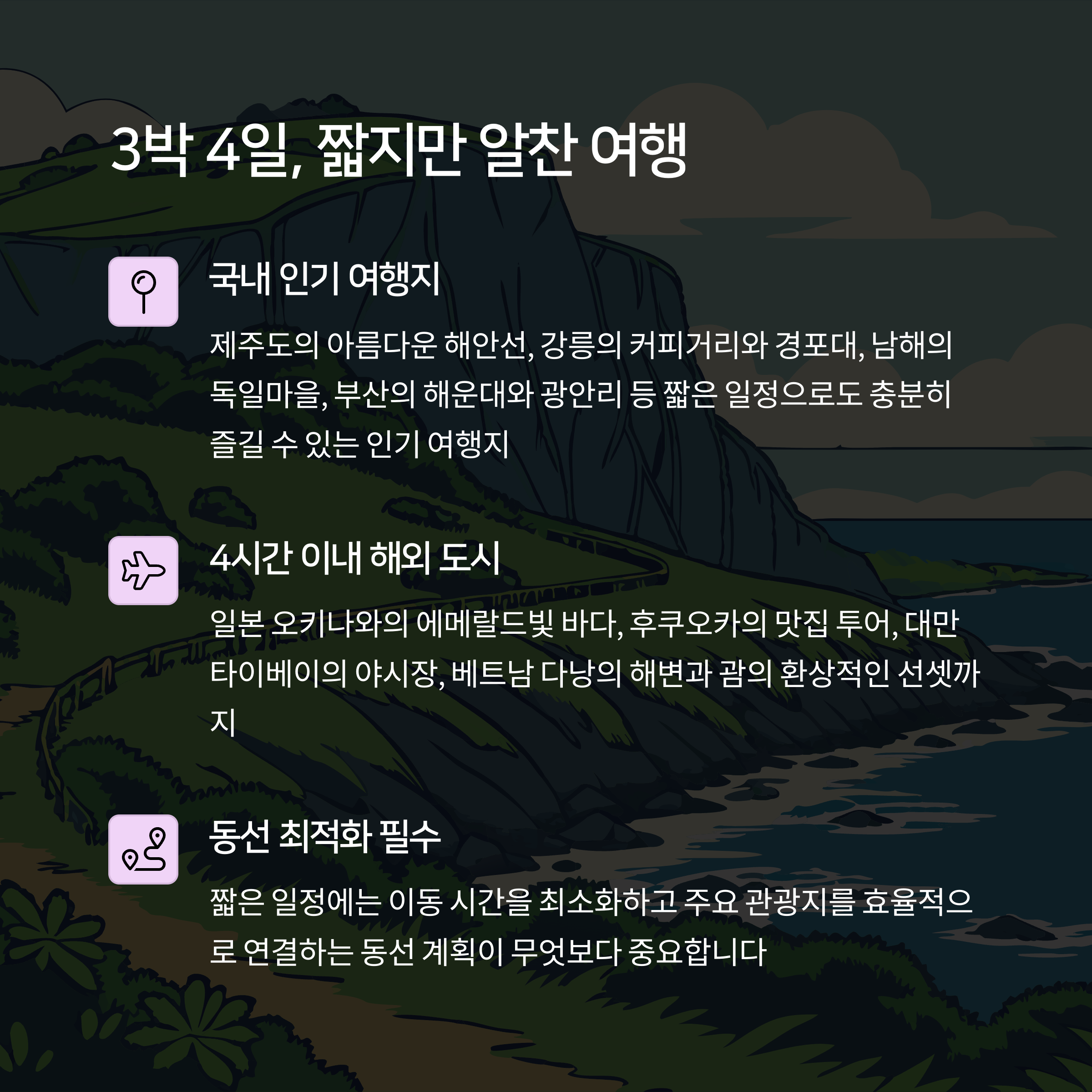 3박 4일이면 멀리 가지 않아도 충분히 '비행기 탄 기분' 낼 수 있어요. 짧지만 진하게 힐링하고 싶은 분들께 추천하는 국내 핵심 여행지 4곳을 골라봤어요.