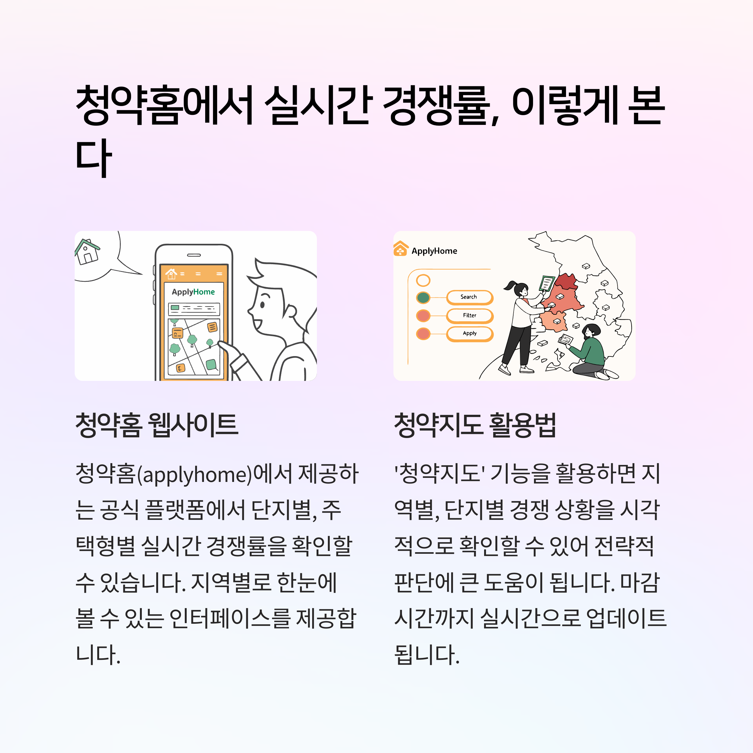 실시간 경쟁률은 청약홈(applyhome)에서 아주 쉽게 볼 수 있어. 신청 가능한 단지 리스트에서 경쟁률 칸을 보면 숫자가 계속 올라가는 걸 확인할 수 있고, 시간대별로 갱신되니까 눈치싸움도 가능해.