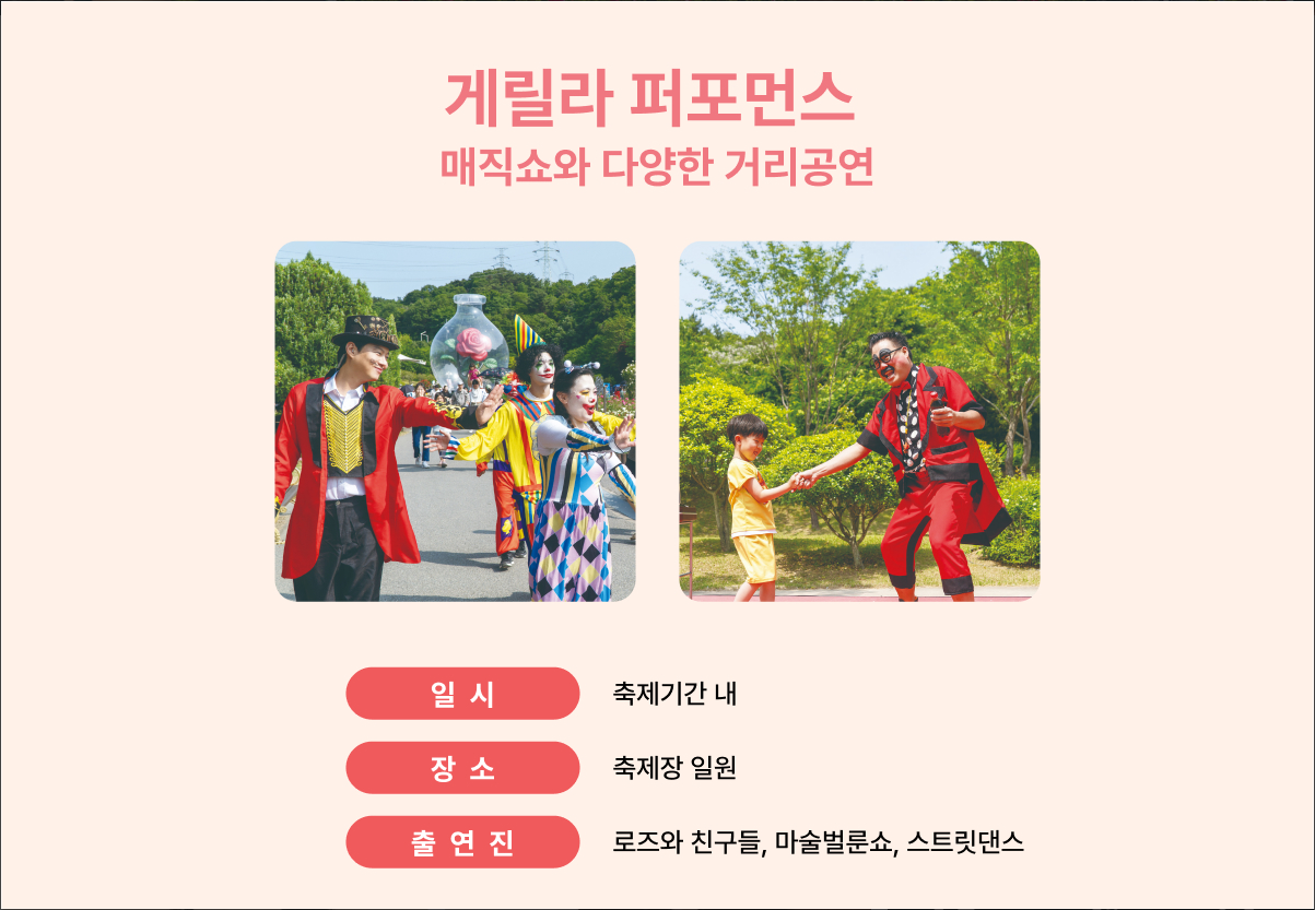 - 다채로운 문화 공연: 지역 예술단체들의 공연, 버스킹, 마술쇼 등 다양한 볼거리가 축제 기간 내내 펼쳐질 거예요.