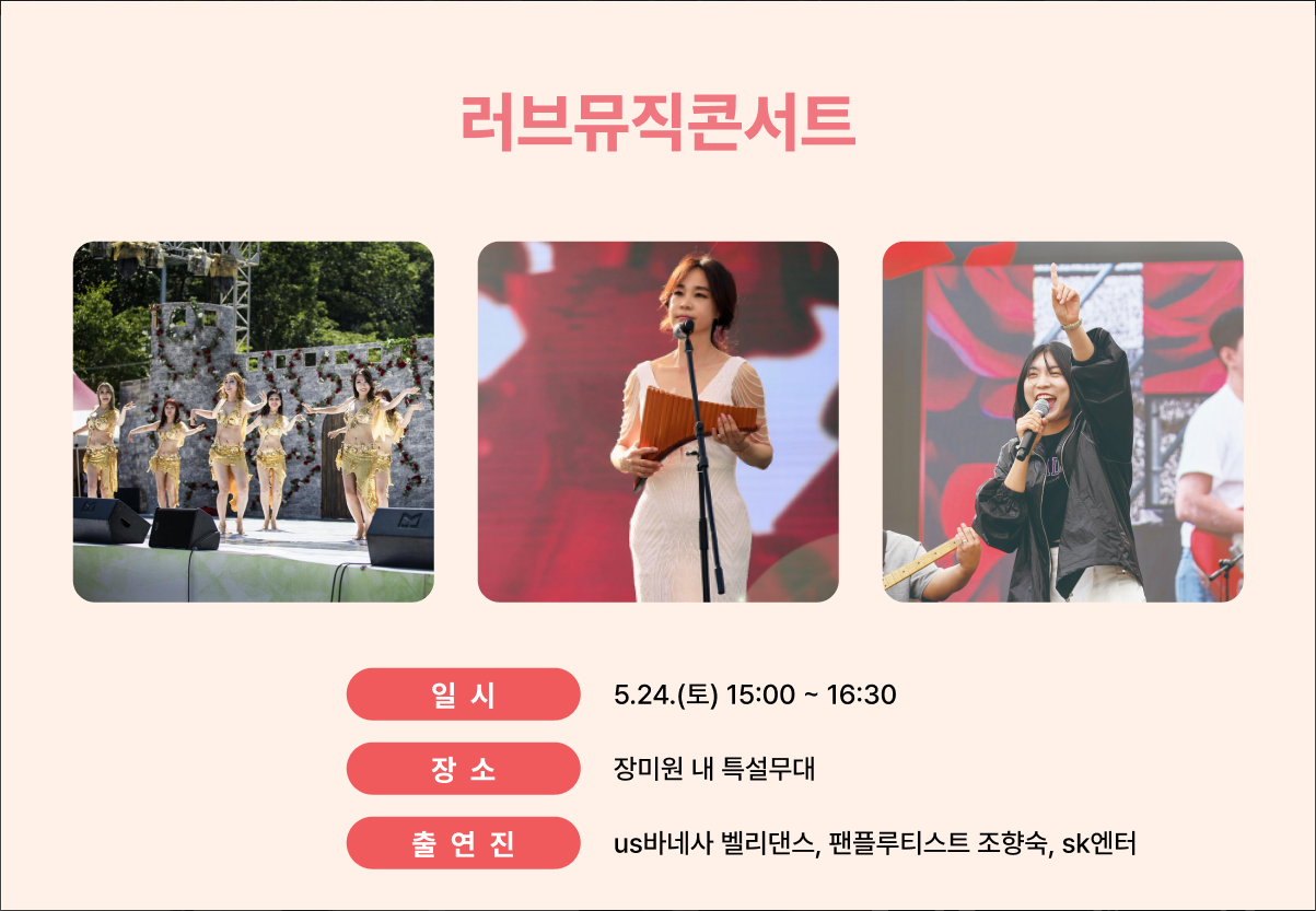 - 즐길 거리: 수십만 송이 장미, 야간 조명쇼, 유명 가수 공연, 문화 행사, 티니핑 등 어린이 콘텐츠